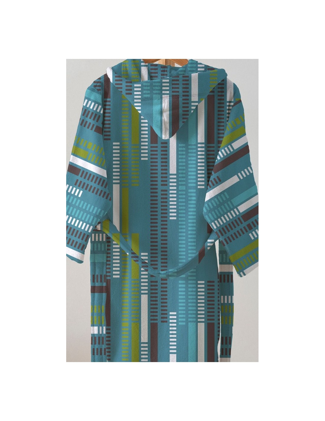Albornoz de fantasía con capucha Code, en color turquesa, de la marca Cottonfeel. Albornoz confeccionado en tejido tacto terciopelo por fuera y 100% algodón peinado por dentro. Estampado de fantasía sobre fondo turquesa, capucha y cordón para atarlo a la cintura. Muy suave y absorbente.